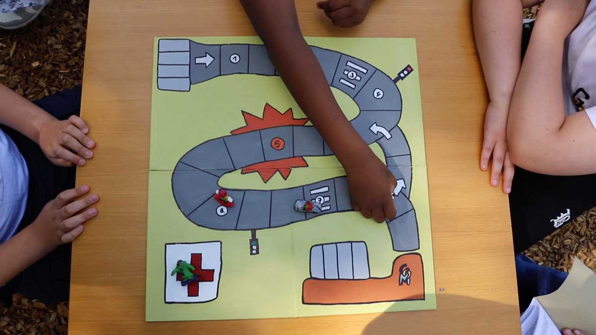 Die Klasse 5e überzeugte die Jury mit ihrem Beitrag „Mein Schulweg safe?!“. Die Schülerinnen und Schüler entwickelten als Kunstprojekt nicht nur ein charmantes Brettspiel, sondern dachten auch über die langfristige Wirkung hinaus: Das Spiel fand Eingang in die Schulbibliothek, wurde in einer Dienstbesprechung dem gesamten Kollegium vorgestellt und auch in weiteren Klassen und Stufen thematisiert.