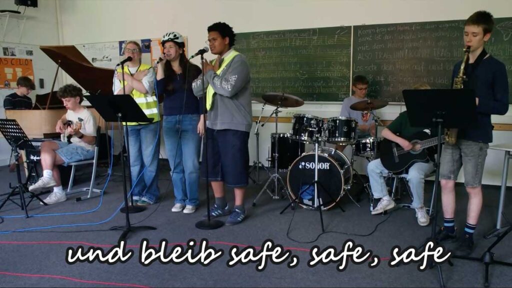 Mit ihrem Beitrag „Setz‘ einen Helm auf!“ hat die Klasse 7c gemeinsam mit der Band-AG des Ratsgymnasiums Münster ein eindrucksvolles Musikvideo geschaffen. Unter der Leitung von Meike Weßling entstand ein Projekt, das zeigt, wie kreativ und zugleich nachhaltig Verkehrssicherheitsbotschaften vermittelt werden können.