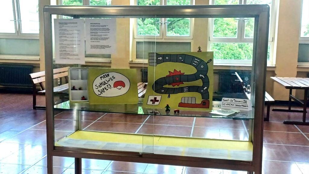 Die Klasse 5e überzeugte die Jury mit ihrem Beitrag „Mein Schulweg safe?!“. Die Schülerinnen und Schüler entwickelten als Kunstprojekt nicht nur ein charmantes Brettspiel, sondern dachten auch über die langfristige Wirkung hinaus: Das Spiel fand Eingang in die Schulbibliothek, wurde in einer Dienstbesprechung dem gesamten Kollegium vorgestellt und auch in weiteren Klassen und Stufen thematisiert.